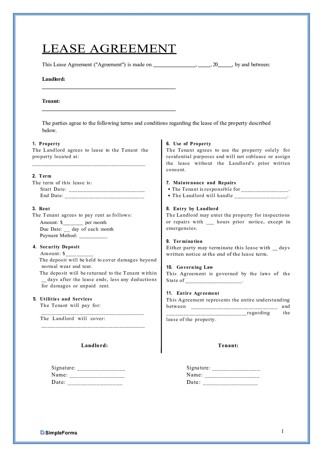 Free Simple 1 Page Lease Agreement Template PDF Word
