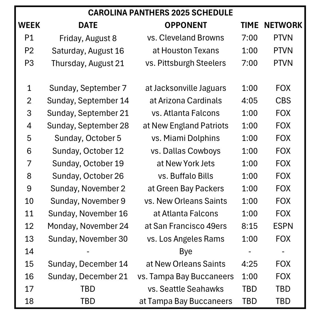 Gabe McDonald On X The Carolina Panthers Official 2025 Schedule In All Its Glory Carolina Returns To Primetime With A Week 12 Matchup On The Road Against The 49ers On Monday Night
