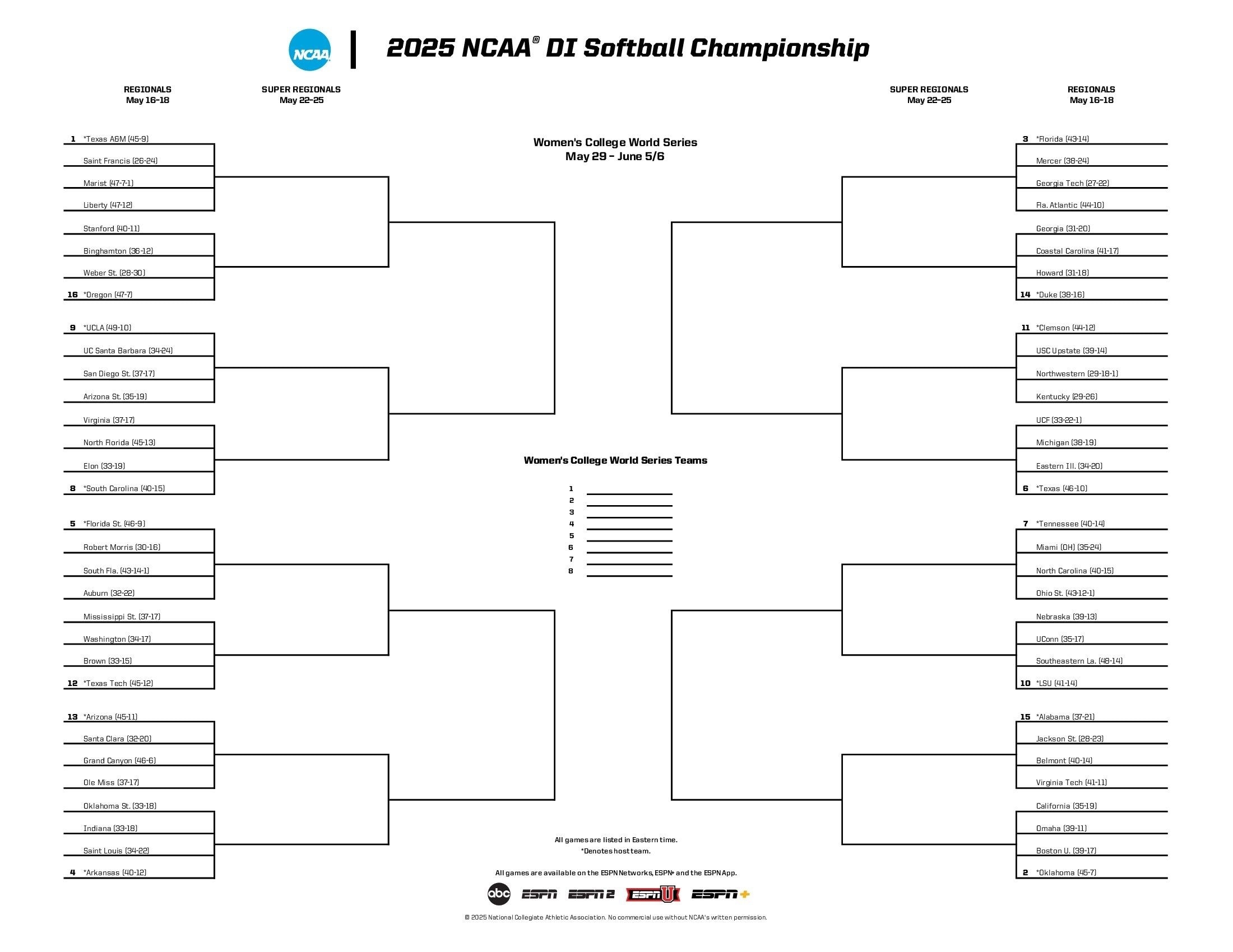 2025 Division I Softball Official Bracket NCAA