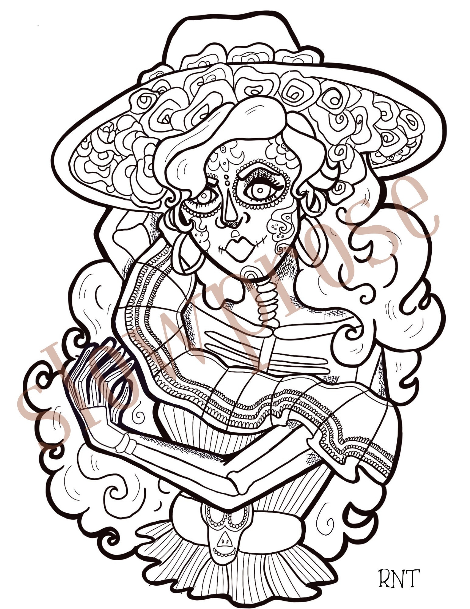Printable Day Of The Dead Woman Coloring Page For Adults Dia De Los Muertos La Catrina Mexican Culture Drawing Mexican Holiday Art Etsy