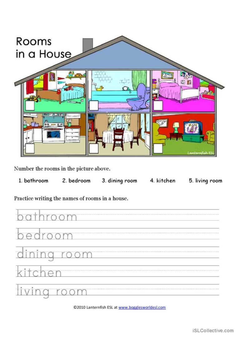 This worksheet includes colorful images of various rooms in a house, such as the kitchen, living room, bedroom, and bathroom. Students can easily identify each room and practice spelling and pronunciation.