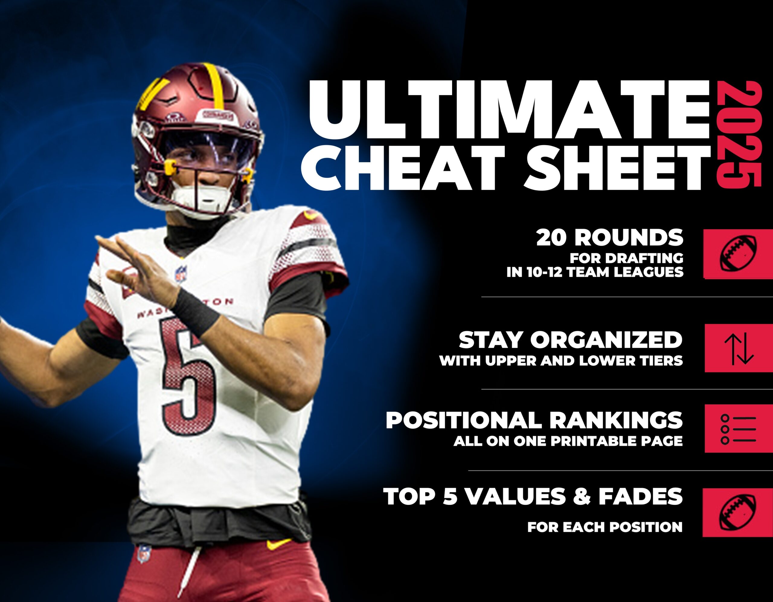 Make this fantasy football season your best one yet by using our cheat sheets to dominate your draft and crush your opponents week after week. With the right tools and preparation, you can turn your fantasy football dreams into reality and hoist that championship trophy at the end of the season!
