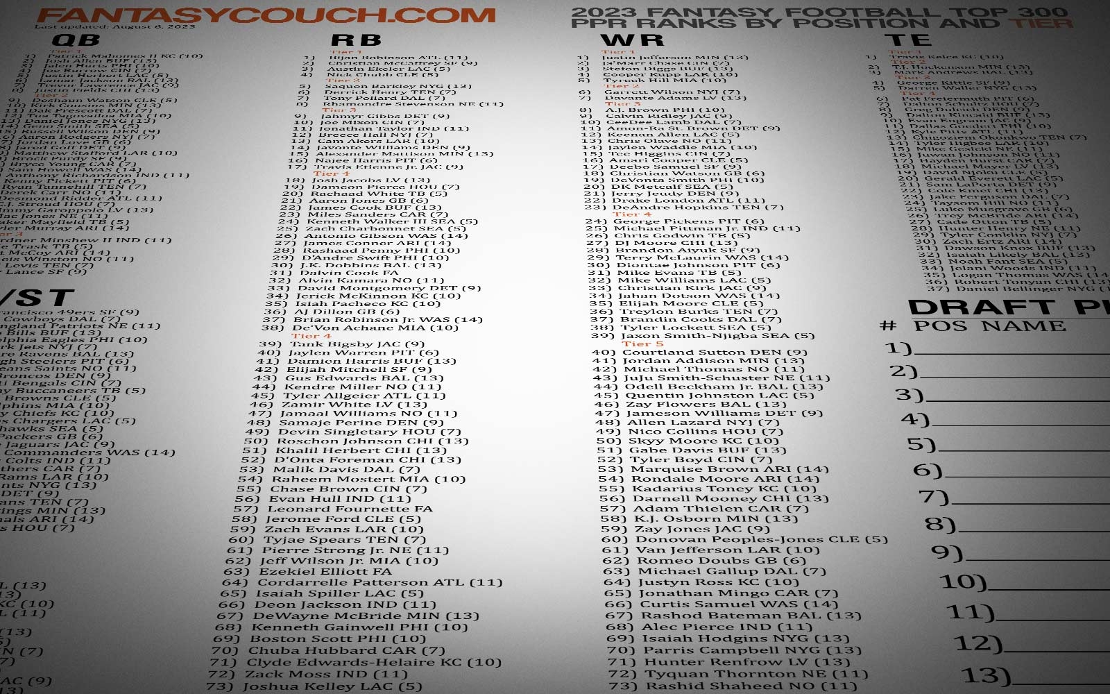 Whether you prefer to draft based on overall rankings or position-specific strategies, our cheat sheets have you covered. Stay ahead of your competition by being prepared with up-to-date information on player injuries, suspensions, and breakout candidates to maximize your team’s potential.