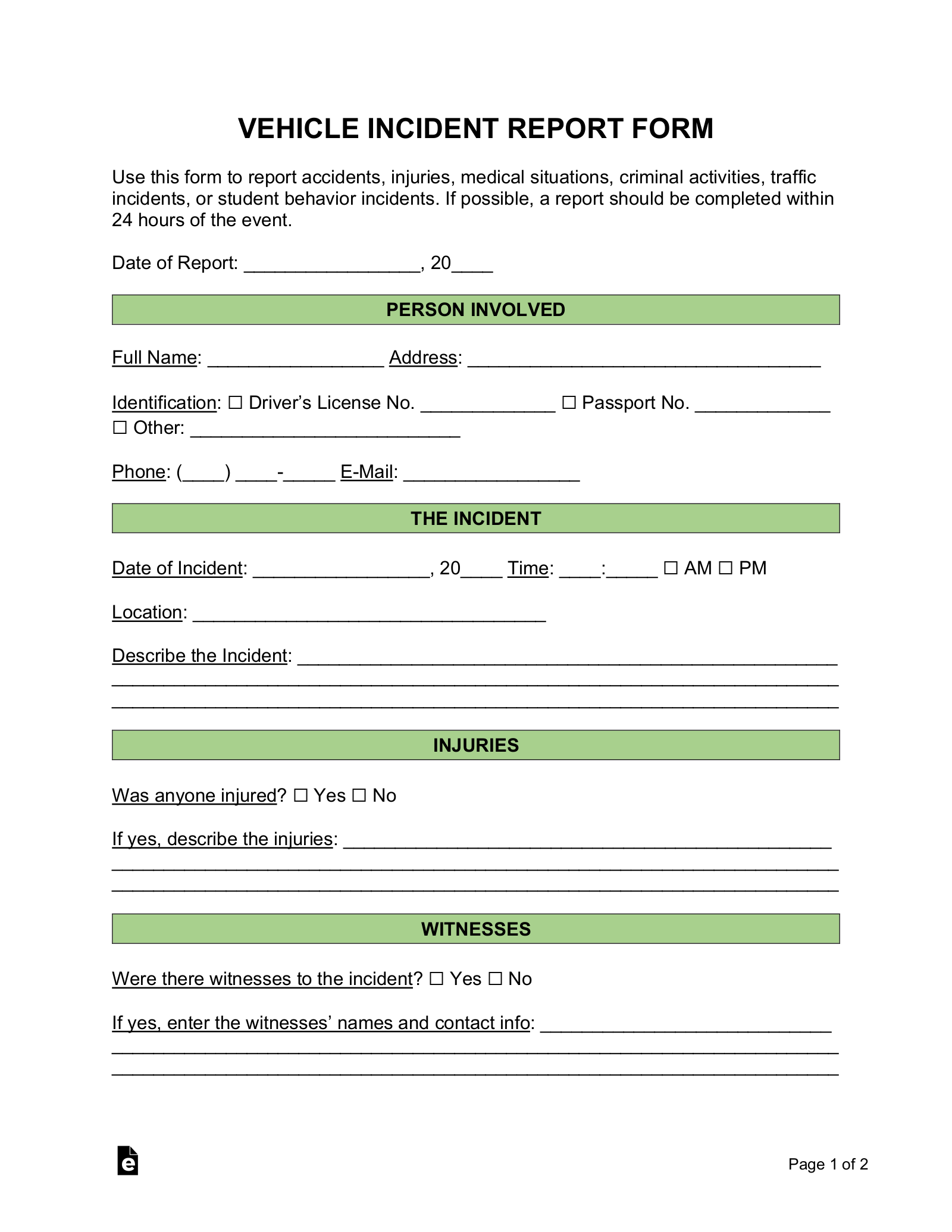 Free Car Motor Vehicle Incident Report Template PDF Word EForms