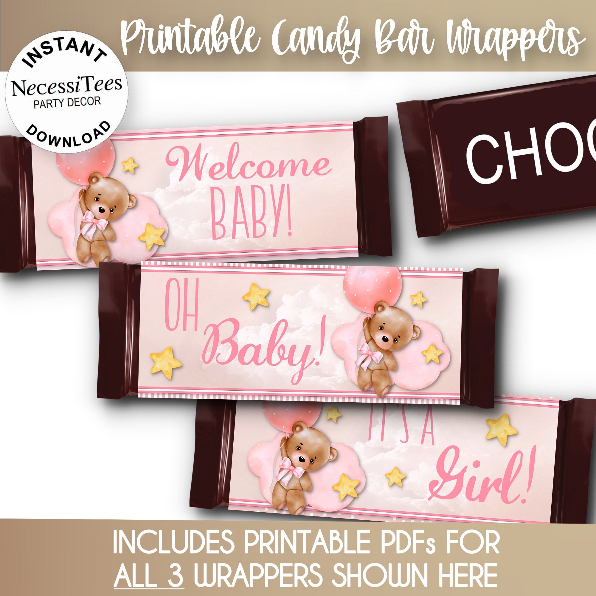 PRINTABLE Baby Shower Candy Bar Wrapper Templates Bear With Pink Balloons 3 Pdfs NOT Editable Instant Download Etsy