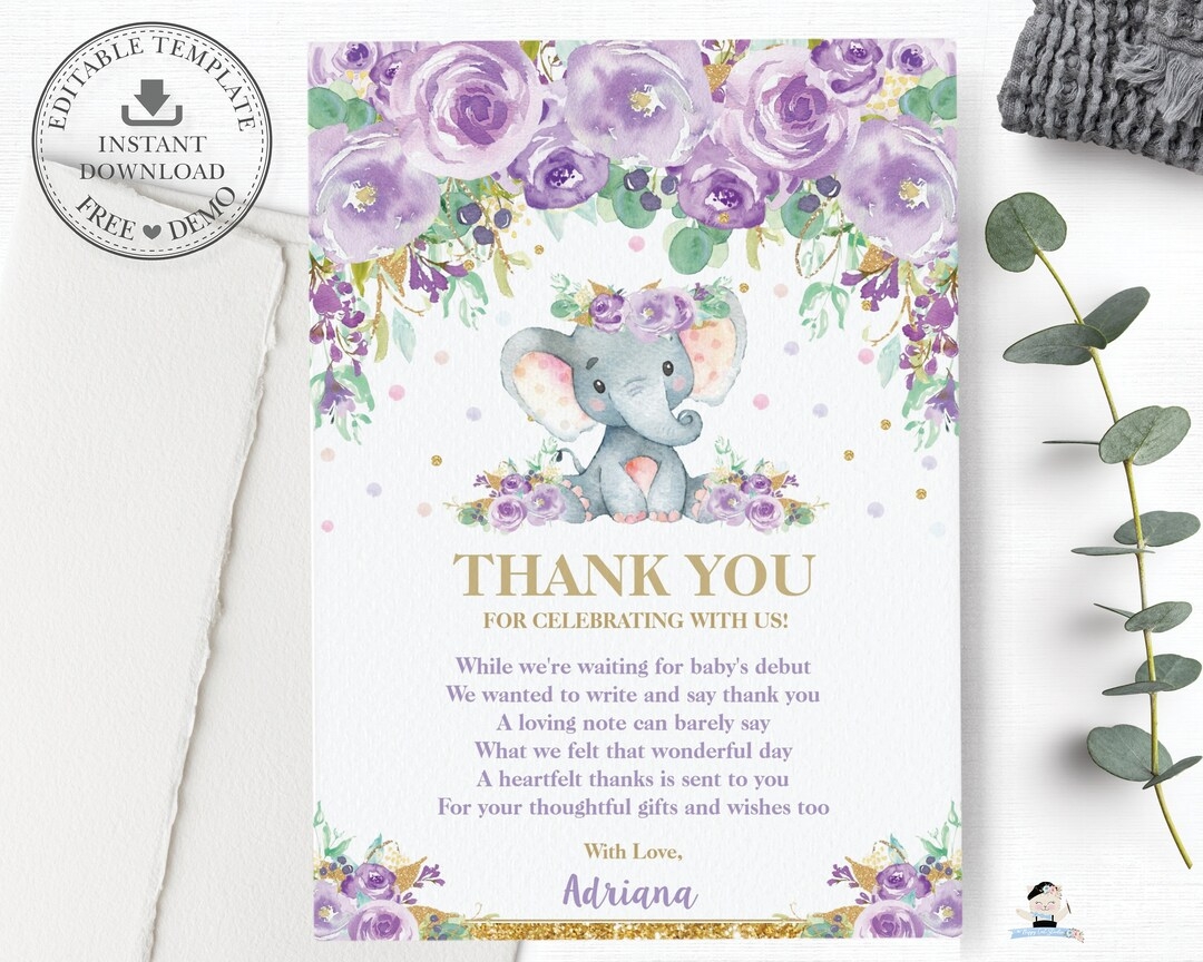 EDITABLE TEMPLATE Elephant Baby Shower Thank You Card Baby Girl Purple Floral Printable Lilac Chic Glitter Gold Whimsical INSTANT EP9 Etsy