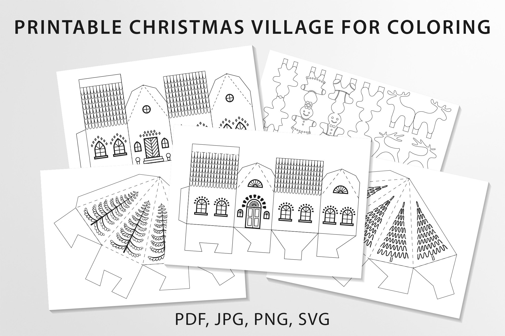 Printable Christmas Village For Coloring DIY Paper Cut SVG