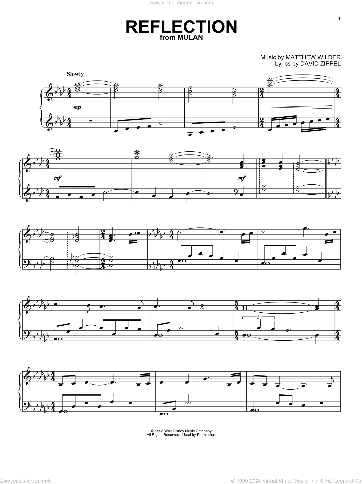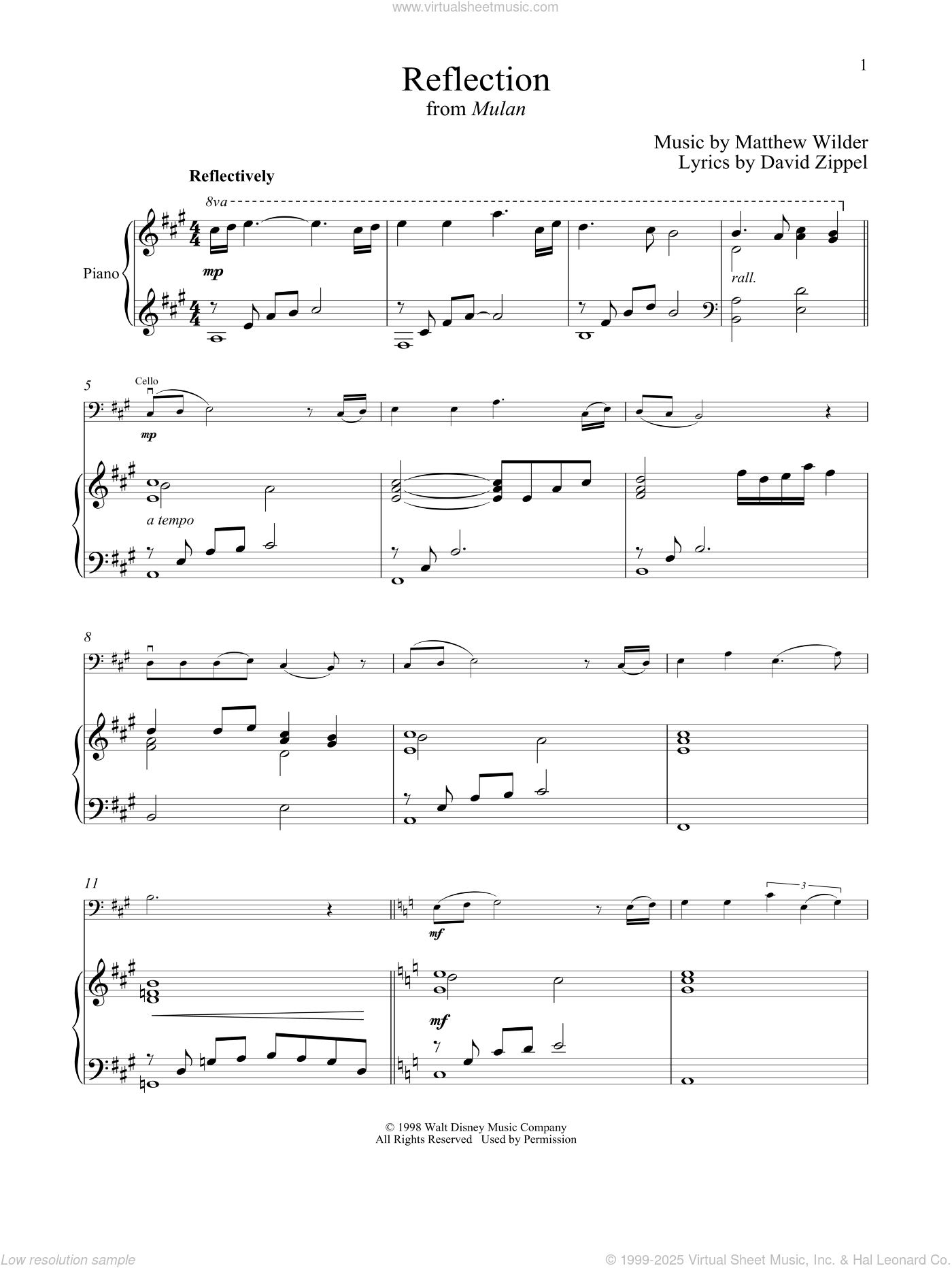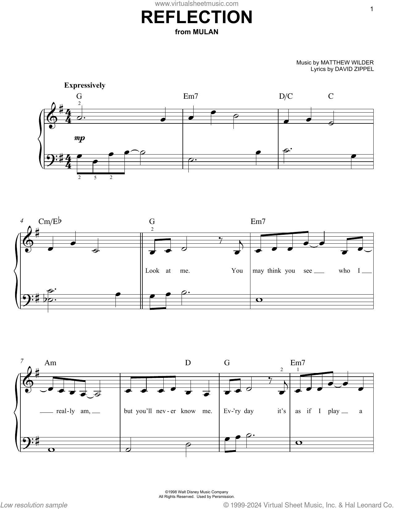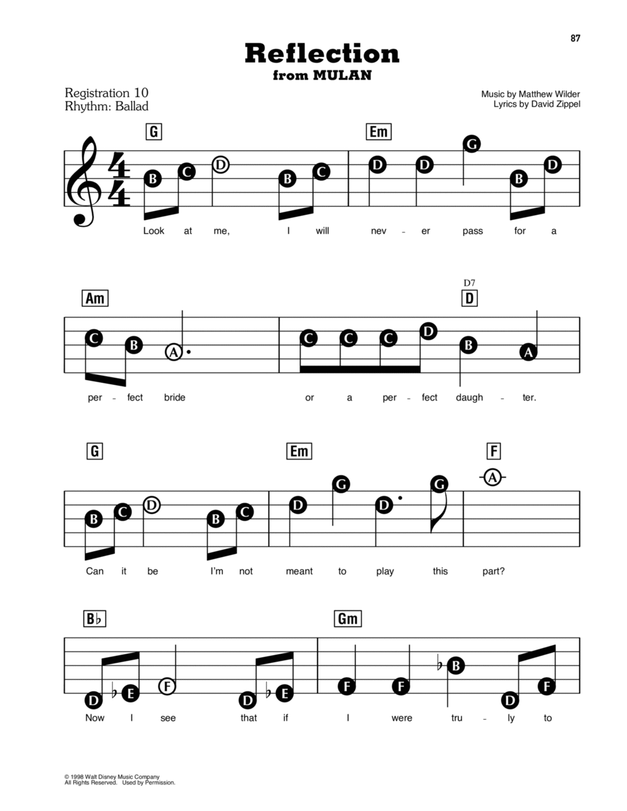 Matthew Wilder Reflection from Mulan Sheet Music For Piano Solo