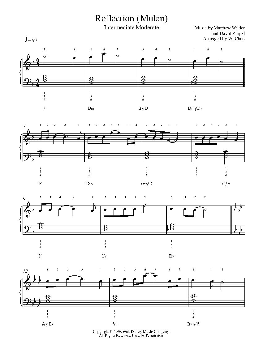 Free Printable Piano Sheet Music Reflection-Mulan