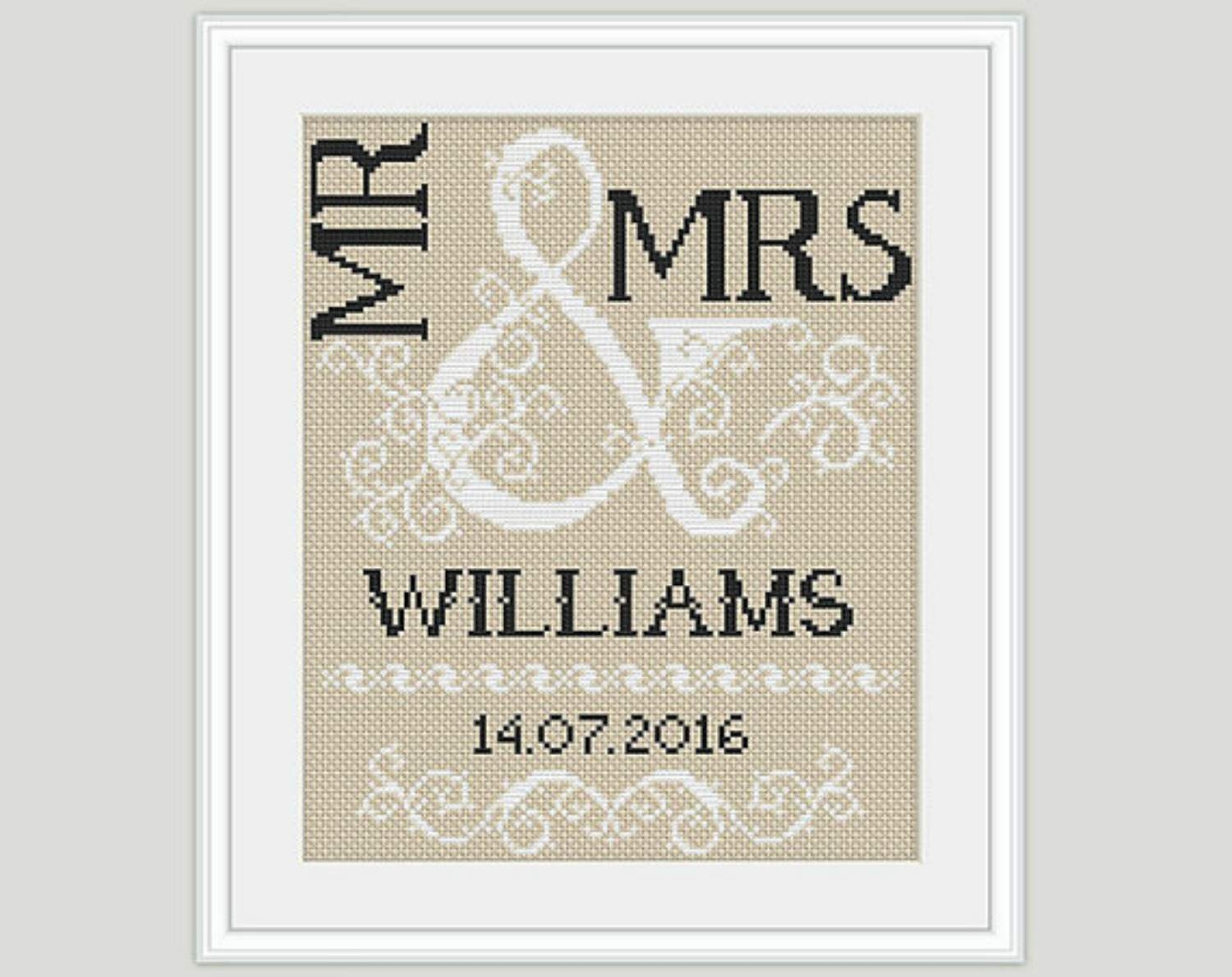 One popular choice for wedding cross stitch patterns is a simple “Mr. & Mrs.” design. This classic pattern is perfect for beginners and can be easily customized with the couple’s initials or wedding date. It’s a timeless and elegant option that will look great in any home.