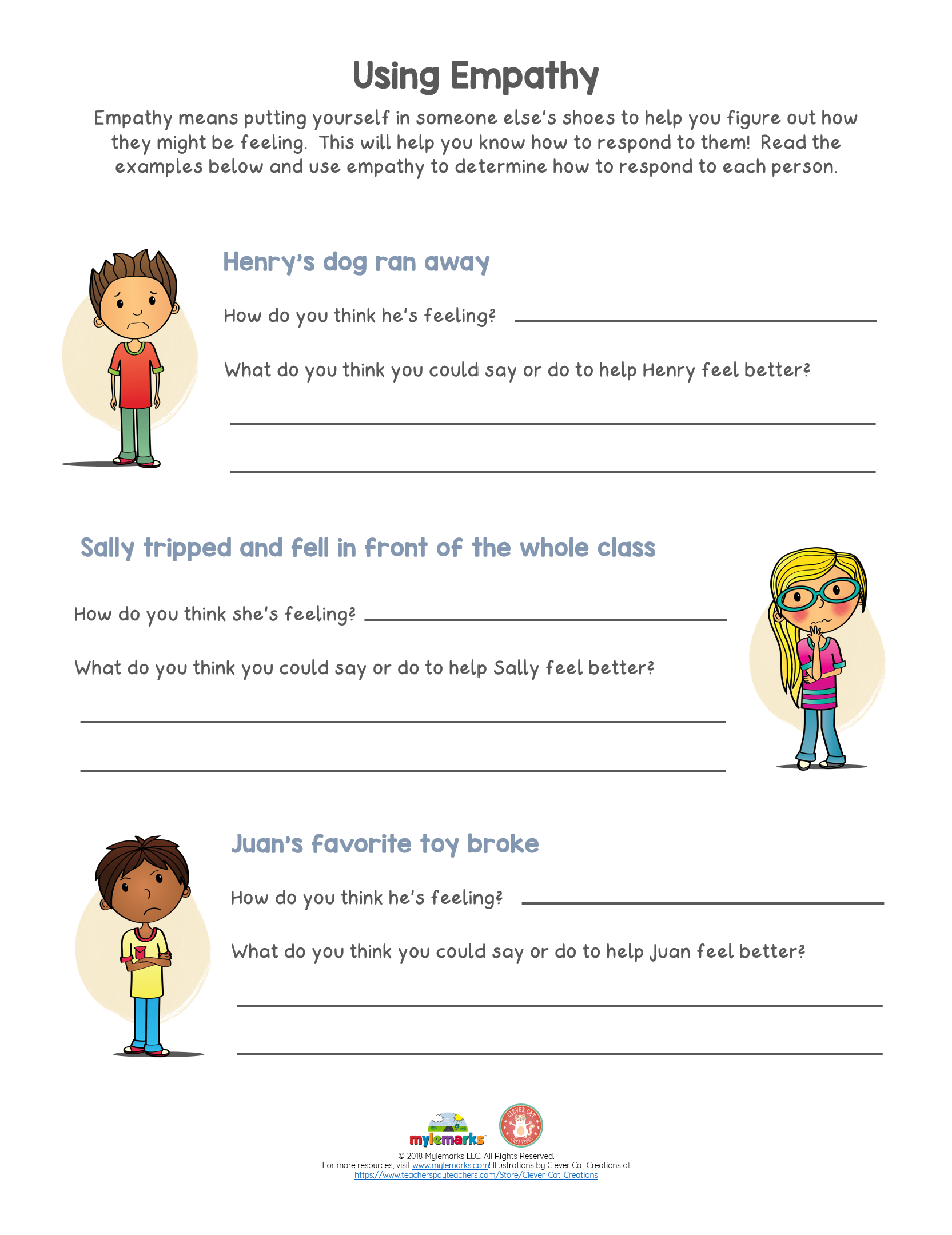 There are a variety of free printable worksheets available online that focus on empathy. These worksheets often include activities such as role-playing scenarios, drawing emotions, and writing about how they would feel in certain situations.