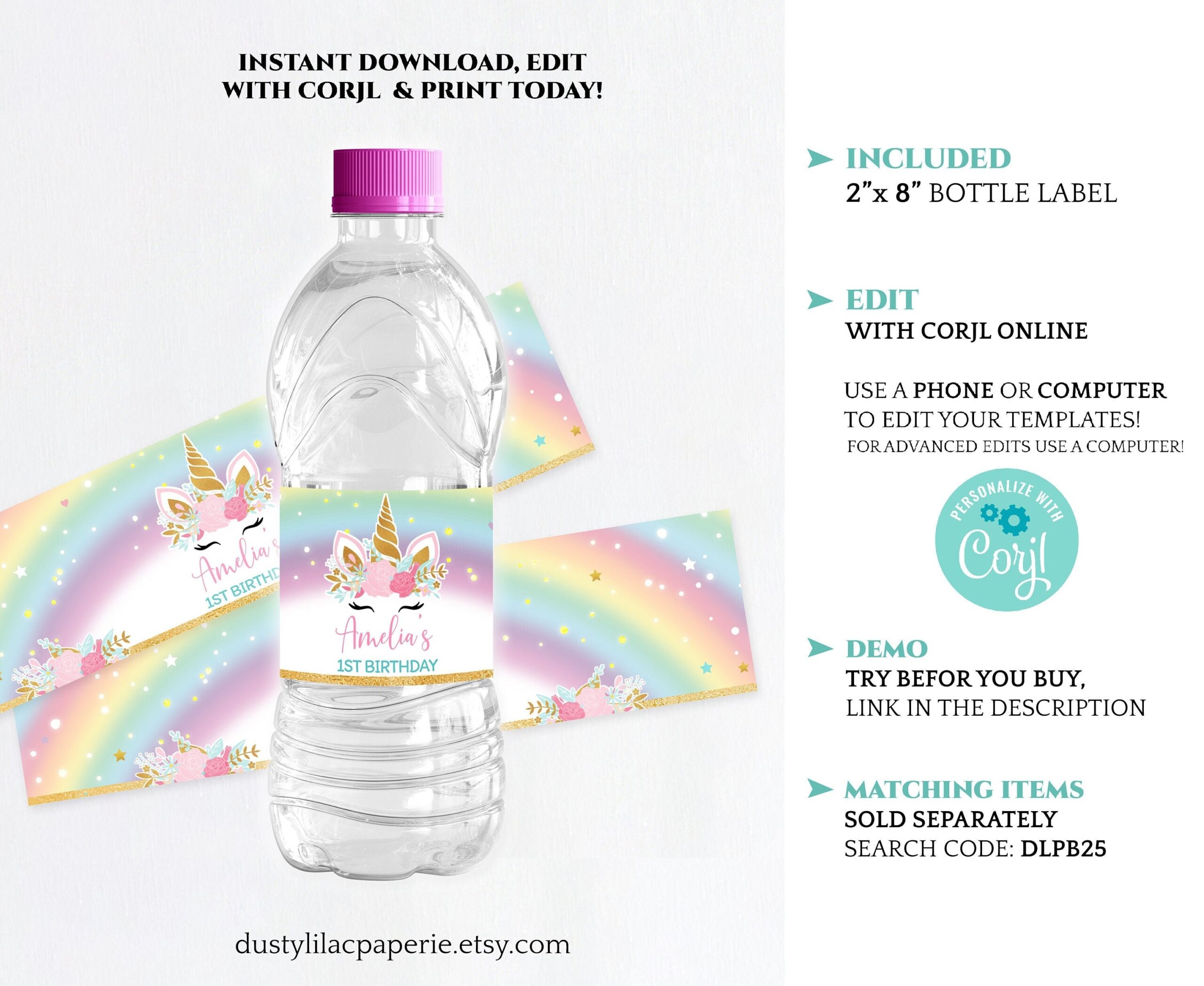 Unicorn Water Bottle Label Editable Rainbow Magical Celebration Girl Birthday Party Label Template Gold Glitter Floral Unicorn DLPB25 Etsy