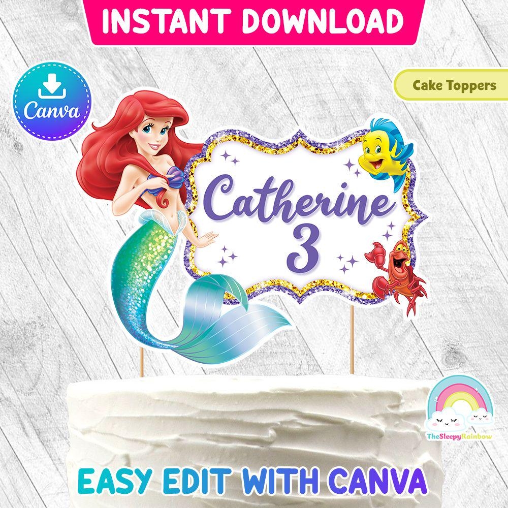 Little Mermaid Birthday Party Cake Toppers Little Mermaid Ariel Printable Birthday Cake Toppers Easy Edit Canva Template Editable File Etsy