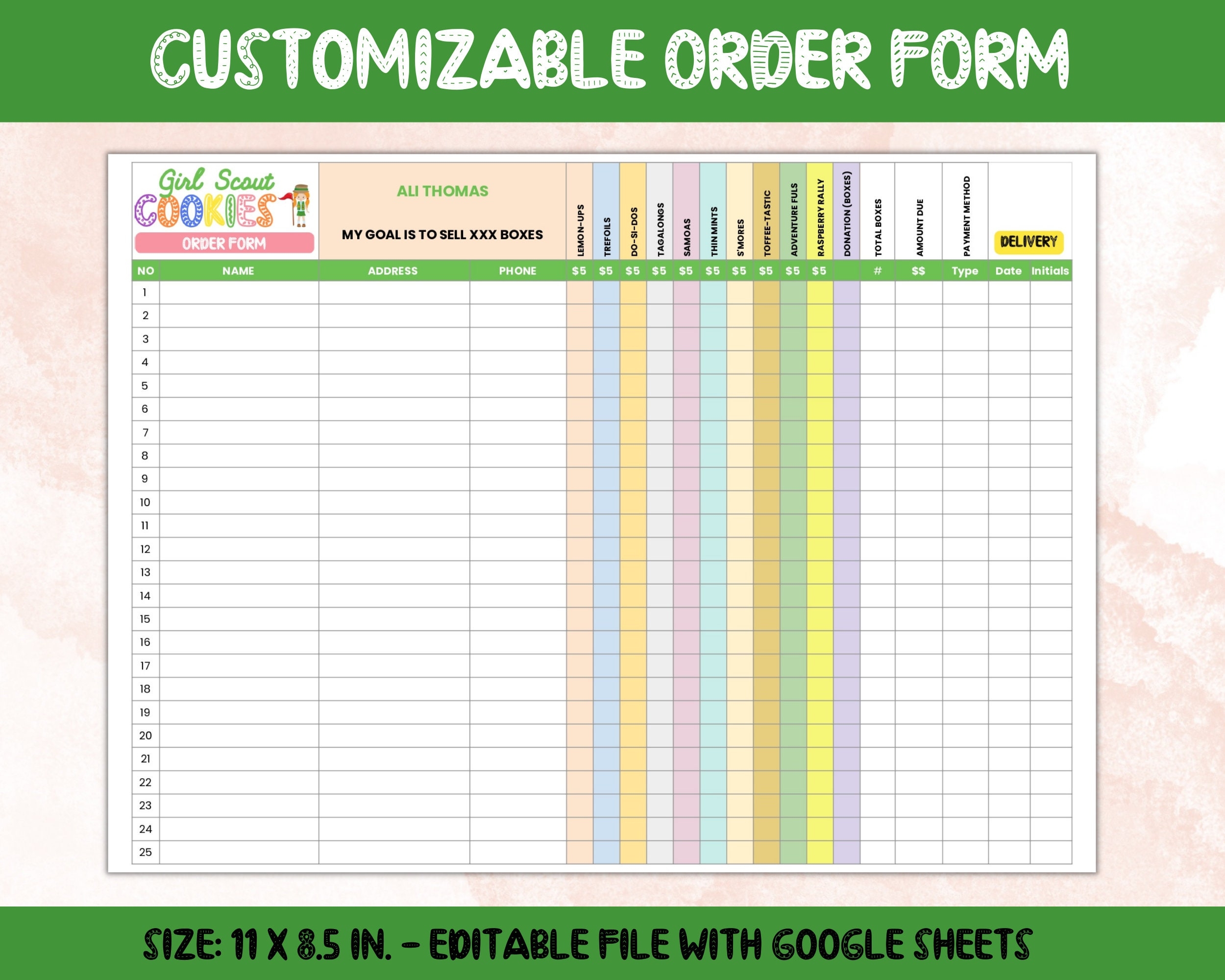 Whether you’re a fan of Thin Mints, Tagalongs, or Samoas, this order form will help you keep track of your cookie cravings. Share it with friends, family, and colleagues to gather their orders as well!