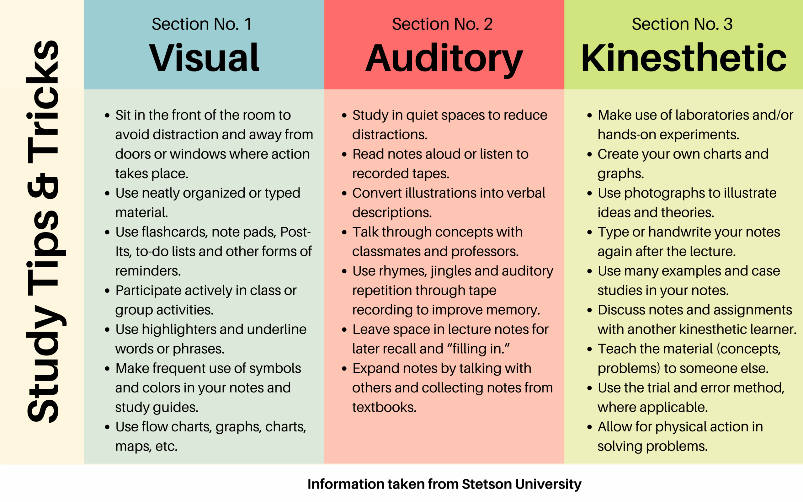 Visual learners may benefit from using diagrams, charts, and color-coded notes to aid in information retention. Auditory learners may find it helpful to listen to lectures or recordings while studying. Kinesthetic learners may prefer hands-on activities or role-playing exercises to reinforce concepts.