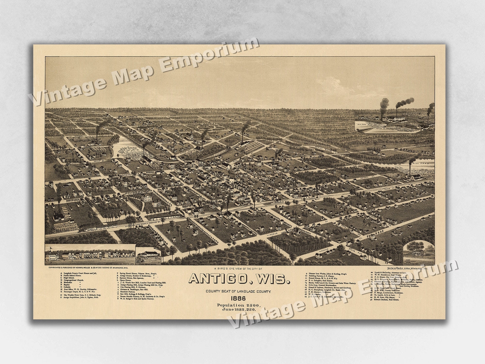 1886 Antigo Wisconsin Map Panoramic Old City Map Historic Birds Eye View Vintage Map Art Print Etsy