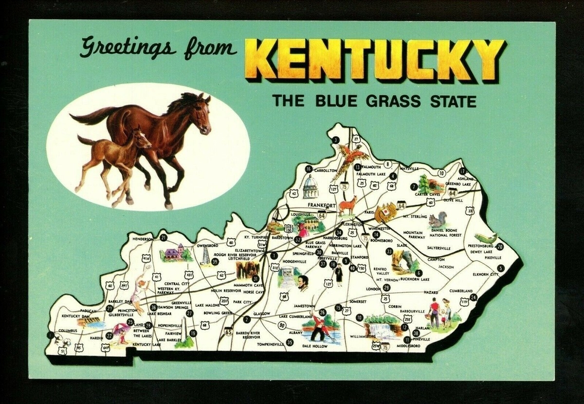 Map Greetings Postcard Kentucky KY Blue Grass State Horse Racing Chrome EBay