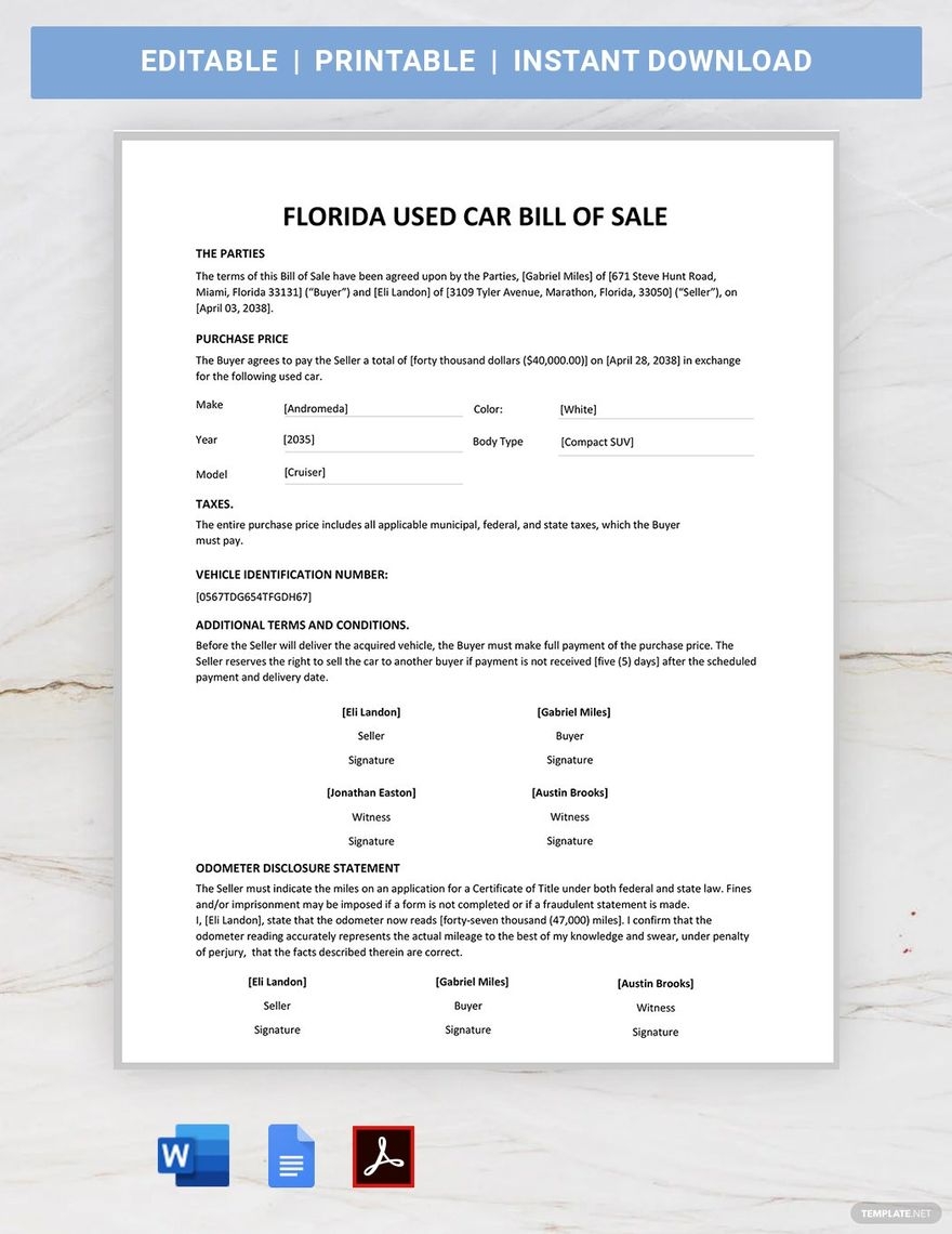 Florida Used Car Bill Of Sale Template In Word PDF Google Docs Download Template
