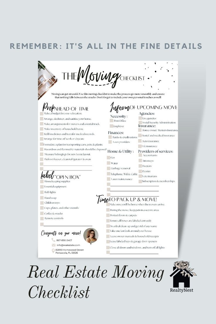 Real Estate Moving Checklist Realtor Moving Guide Printable Moving To do List Moving Planner