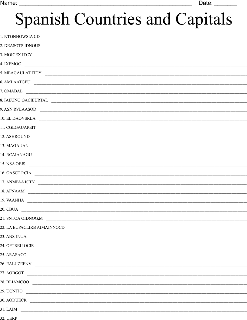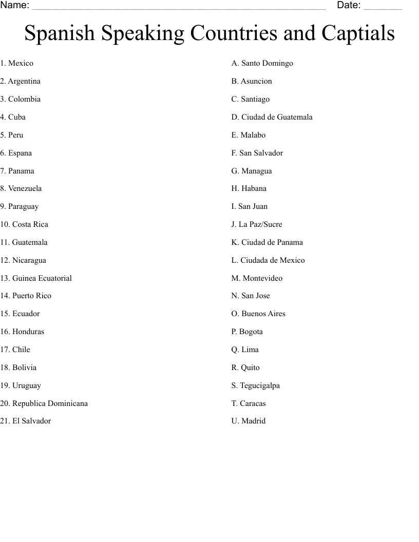 Spanish Speaking Countries And Capitals Worksheet WordMint