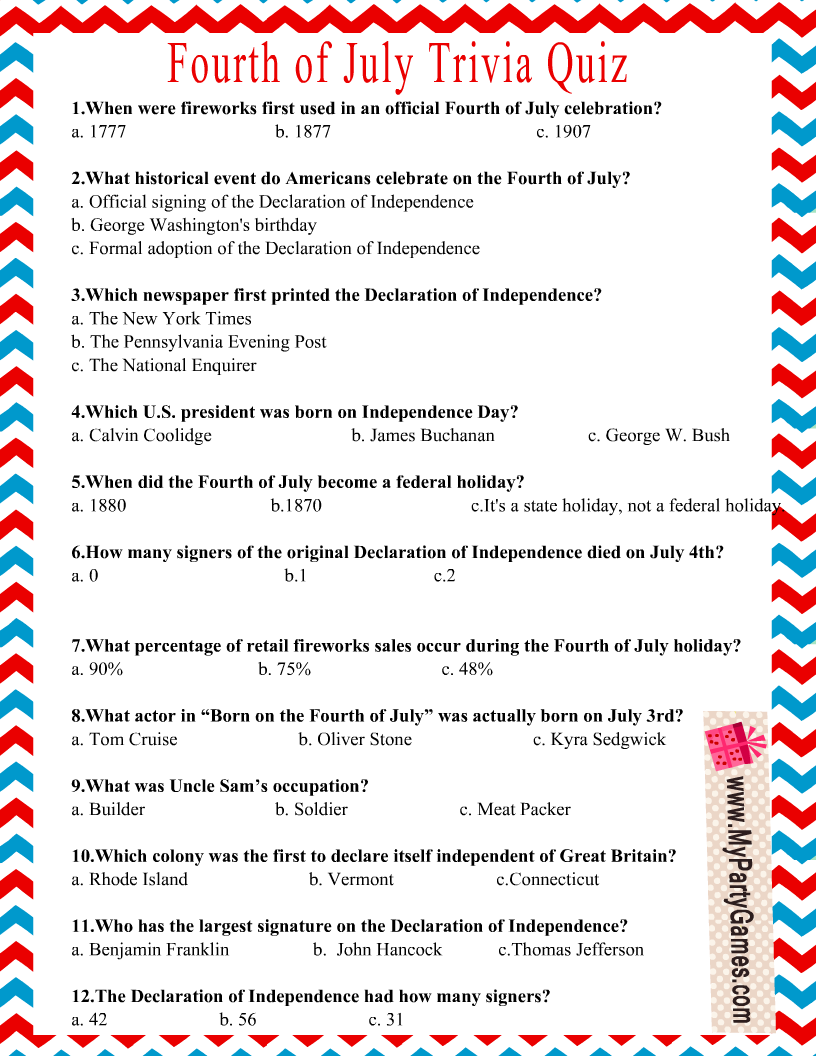 Free Printable 4th Of July USA Independence Day Trivia Quiz