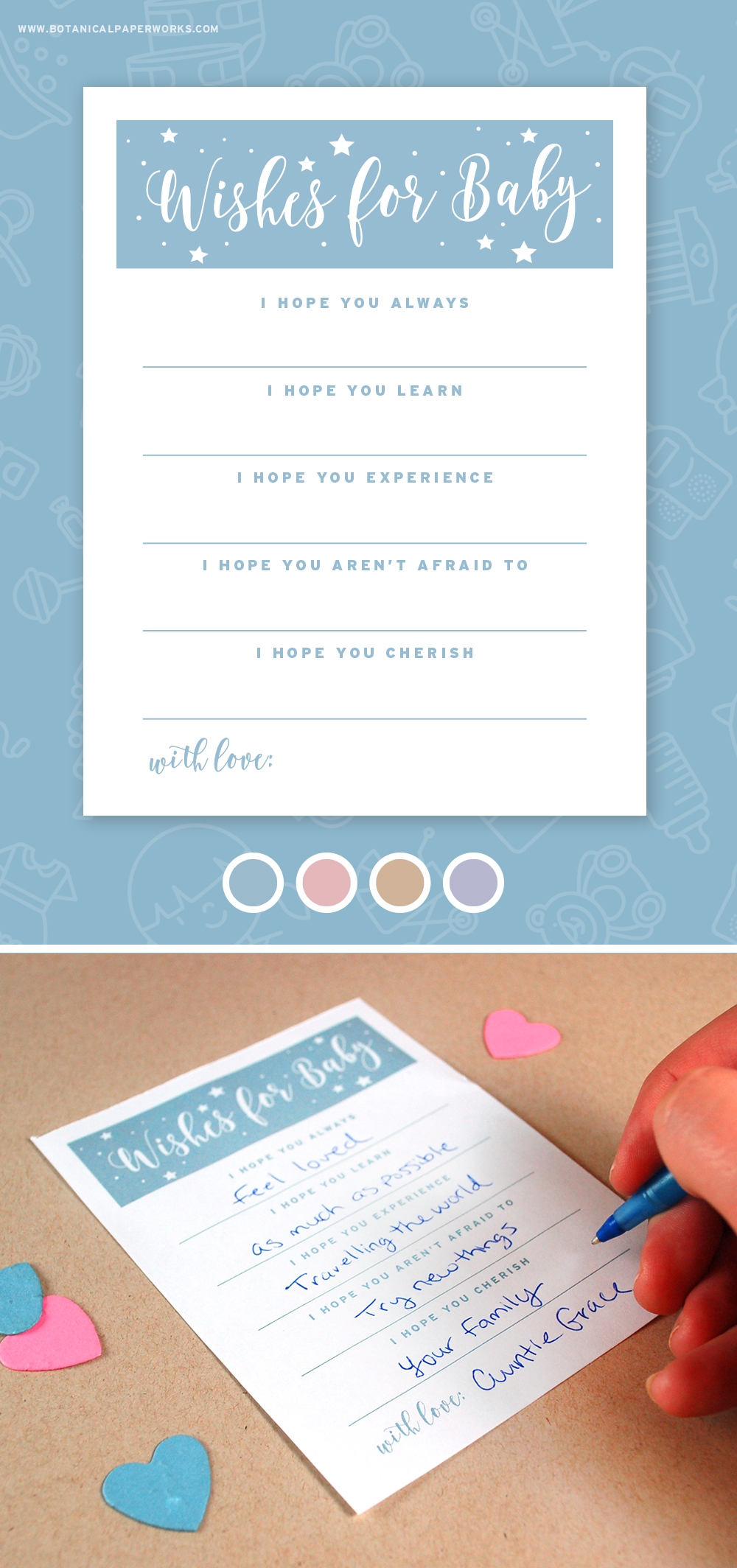 Once your guests have written their heartfelt messages, collect the cards in a keepsake box or binder to cherish for years to come. These printables are a wonderful memento that the parents-to-be can look back on and share with their child as they grow up.